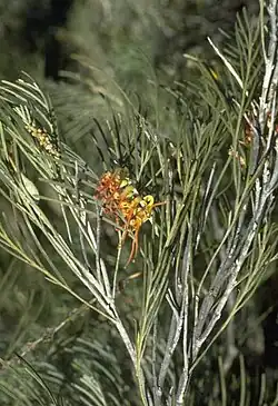 Grevillea baxteri is an erect to spreading shrub that typically grows to a height of 0.8–3.6 m (2 ft 7 in – 11 ft 10 in). Its leaves are pinnatipartite with seven to fifteen linear lobes, the ultimate lobes 40–80 mm (1.6–3.1 in) long and 1.0–1.5 mm (0.039–0.059 in) wide with the edges rolled under. The flowers are greenish to fawn or creamy orange, on a rachis 4–85 mm (0.16–3.35 in) long and covered with silky or felty hairs. The pistil is 22–25 mm (0.87–0.98 in) long, and the style is hairy. Flowering occurs in most months with a peak from July to November and the fruit is a follicle 14.0–15.5 mm (0.55–0.61 in) long.[3]