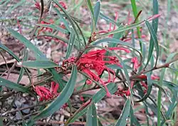 Grevillea dimorpha, commonly known as flame grevillea or olive grevillea,[2] is a species of flowering plant in the family Proteaceae and is endemic to the Grampians National Park in Victoria, Australia. It is an erect to spreading shrub with elliptic to linear or egg-shaped leaves with the narrower end towards the base, and groups of bright red flowers.