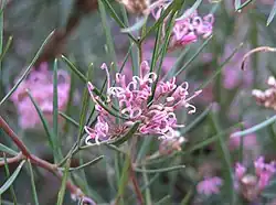 Grevillea gariwerdensis is a shrub that typically grows to a height of 0.3–1 m (1 ft 0 in – 3 ft 3 in) and has ridged branchlets with silky hairs between the ridges. Its leaves are more or less linear to oblong or egg-shaped with the narrower end towards the base, 10–30 mm (0.39–1.18 in) long and 1–3 mm (0.039–0.118 in) wide. The flowers are usually arranged on the ends of branchlets in groups of six to sixteen on a peduncle up to 15 mm (0.59 in) long and are white to pink with brownish hairs, the pistil 7–8.5 mm (0.28–0.33 in) long. Flowering occurs from October to January and the fruit is a narrowly oval follicle 9–10 mm (0.35–0.39 in) long.[2][3]