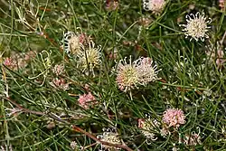 - Grevillea hakeoides Meisn. subsp. hakeoides[8] has more or less cylindrical leaves usually 30–50 mm (1.2–2.0 in) long and 0.5–0.8 mm (0.020–0.031 in) wide, and greenish-white to creamy-grey or pinkish flowers;[9]