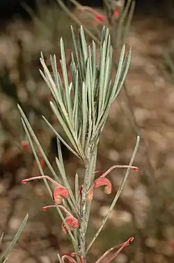 Grevillea haplantha is a shrub that typically grows to a height of 0.6–2.2 m (2 ft 0 in – 7 ft 3 in). Its leaves are linear, 15–80 mm (0.59–3.15 in) long and 1.0–1.7 mm (0.039–0.067 in) wide with the edges rolled under, obscuring most of the lower surface. The flowers are arranged in loose clusters of up to six in leaf axils or the sides of branches on a rachis 0.7–1.5 mm (0.028–0.059 in) long, the pistil 18–25 mm (0.71–0.98 in) long. Flowering time and colour vary with subspecies. The fruit is an oval to elliptic follicle 10–13 mm (0.39–0.51 in) long.[3][4][5]