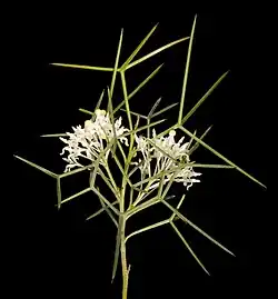 Grevillea paniculata is a dense, often prickly shrub that typically grows to a height of 0.6–3 m (2 ft 0 in – 9 ft 10 in) and sometimes has silky-hairy branchlets. The leaves are 25–60 mm (0.98–2.36 in) long and divided, with three to five lobes that are sometimes divided again, the end lobes 20–40 mm (0.79–1.57 in) long and 0.5–0.8 mm (0.020–0.031 in) wide. The edges of the leaves are rolled under, obscuring the lower surface except for the prominent mid-veins. The flowers are arranged in more or less spherical clusters and are white to cream-coloured and glabrous, the pistil 3–4 mm (0.12–0.16 in) long. Flowering occurs from May to October and the fruit is an oblong follicle 8–9 mm (0.31–0.35 in) long.[2][3]