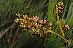- Grevillea petrophiloides (Olde & Marriott) Makinson subsp. remota McGill.[14] has fewer than ten linear end leaf-lobes that are circular or triangular in cross-section, 30–120 mm (1.2–4.7 in) long and 0.5–1.0 mm (0.020–0.039 in) wide, mainly flowers from June to October, and has flowers with a straw-white or very pale pink style.[15][16]