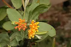 Grevillea pimeleoides is a robust, erect shrub that typically grows to a height of 0.6–2.5 m (2 ft 0 in – 8 ft 2 in) and does not form a lignotuber. Its leaves are elliptic to egg-shaped with the narrower end towards the base, 20–65 mm (0.79–2.56 in) long, 7–20 mm (0.28–0.79 in) wide and glabrous, apart from a few hairs on the upper surface. The flowers are arranged in clusters of 13 to 18 on one side of a rachis 1–2 mm (0.039–0.079 in) long and are light orange in the bud stage, yellow as the flowers open, then orange again, the end of the style yellow, turning red, the pistil usually 7–8 mm (0.28–0.31 in) long. Flowering occurs from July to November and the fruit is an oval follicle about 15 mm (0.59 in) long.[2][3]