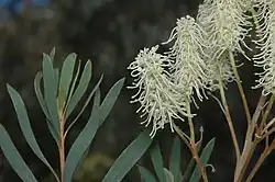 Greville polybotrya is an erect, bushy shrub that typically grows to a height of 1–4 m (3 ft 3 in – 13 ft 1 in). Its leaves are egg-shaped to lance-shaped with the narrower end towards the base, or oblong, 12–50 mm (0.47–1.97 in) long and 4–9 mm (0.16–0.35 in) wide. The edges of the leaves are thickened, both surfaces similar and more or less glabrous. The flowers are borne on panicles held above the rest of the foliage, the panicles with 10 to 20 cylindrical branches 60–80 mm (2.4–3.1 in) long. The flowers are pinkish-cream in the bud stage, later white to cream-coloured and have a caramel-like scent, the pistil 7.5–10 mm (0.30–0.39 in) long. Flowering mainly occurs from September to December and the fruit is an oval follicle 11–15 mm (0.43–0.59 in) long.[2][3]