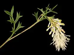 Grevillea pulchella is a spreading shrub that typically grows to a height of 0.2–1.5 m (7.9 in – 4 ft 11.1 in). Its leaves are 20–75 mm (0.79–2.95 in) long, 10–50 mm (0.39–1.97 in) wide and usually pinnatisect with 5 to 19 lobes, each further divided with 3 to 5 triangular or linear lobes 2–18 mm (0.079–0.709 in) long and 1.5–7 mm (0.059–0.276 in) wide. The edges of the leaves are turned down or rolled under, the lower surface usually with a few soft hairs. The flowers are arranged on the ends of branches or in upper leaf axils in cylindrical to oval clusters 15–45 mm (0.59–1.77 in) long, the flowers at the base of the cluster opening first. The flowers are white to cream-coloured, the pistil 5–8.5 mm (0.20–0.33 in) long. Flowering mainly occurs from June to December and the fruit is a glabrous but sticky follicle 5.5–9 mm (0.22–0.35 in) long.[2][3]