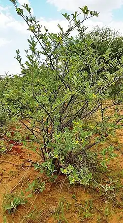 Grewia flava, the brandy bush, wild currant, velvet raisin, or raisin tree, is a species of flowering plant in the family Malvaceae, native to southern Africa.[2] A common shrub species, it is spreading into grasslands due to human rangeland management practices, and increasing rainfall.[3] The berries, which are yellowish-brown and slightly lobed, are sweet and edible, but have little flesh and so are typically collected in large quantities to be eaten raw, dried or fermented into alcoholic beverages.[4][5] The wood has a number of uses such as for making bows, knobkerries, traps and other tools.[4] The desert truffle Kalaharituber pfeilii is often found in association with its roots.[5]