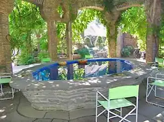 An avid gardener,[15] she turned her attention to the grounds. Chester Holmes Aldrich first designed a swimming pool for the property, a raised structure enclosed on three sides by a pergola of stone piers and wooden trellises. After that came the Bait Box, a playhouse for the couple's son, Gifford Bryce Pinchot. Elliptical openings in the stone walls around the courtyard provide views over the surrounding landscape. Next, in the late 1920s, when her husband was serving his first term as governor, came the Letter Box, a small cottage intended both as an archive for his papers and an office for his political staff when he was in residence. In their last collaboration, Aldrich and Cornelia Pinchot added a moat, which finally gave the house the raised effect Hunt had originally intended. In building it became necessary to lengthen the east lawn and build a new stone wall to support the moat.[7]