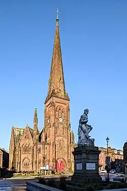 Greyfriars Church, Dumfries, is a Category A listed building in Dumfries, in southwest Scotland.[1] The current Greyfriars Church building was built from 1866 to 1868 in the Victorian Gothic style, designed by architect John Starforth. It is situated in a prominent position at the top of the High Street, and is constructed of local red sandstone taken from Locharbriggs Quarry. The building has an abundance of ornate decorative stonework, including impressive figures and foliage around the entrance doorway. These carvings are attributed to local stonemason and sculptor, William Flint.