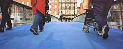 Bridge 2, drew on ideas that Greyworld had explored in a previous work of art Playground, installed in the Yorkshire Sculpture Park in the UK. Visitors to the sculpture park stumbled across what looked like a deserted playground with faded markings for mysterious games and benches for spectators. All the elements of the installation, the floor of the playground and the accompanying benches, were sensitised with tiny sensors so that as people crossed the floor they triggered the sound of people playing a game whilst as others sitting on the bench found themselves immersed in the sound of spectators cheering and clapping. The installation is a permanent feature of the sculpture park.