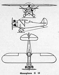 The G-10 had a large cut-out in the wing trailing edge over the open cockpit, from which the pilot could see both below and above the wing. The tailplane was positioned on top of the fuselage and braced from below with two parallel struts. The fin was almost triangular though it rounded at the top into a broad, curved, deep unbalanced rudder which extended down to the keel. The G-10 had a fixed tail skid undercarriage; each of the main wheels, enclosed in broad spats, was hinged on a pair of V-form struts to the central fuselage with a vertical, faired shock absorber from the axle to the central fuselage.[2]