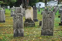 In March 1834, the West Aurora Cemetery Society was organized with Henry L. Baker as clerk. The land was presented as a gift by Colonel Orange Train Brown. The site was an old peach orchard located on West Falls Road just south of Mill Road, now adjacent to St. Paul's Lutheran Church. Prior to this cemetery, many bodies were buried in the West Aurora Graveyard Cemetery which was established before April 5, 1829, and located in a low point near where the road forded the creek. They were subsequently moved to this new plot. Among them were five soldiers of the Revolutionary War: Thomas Treat (1758-1832), Henry Little (1758-1840), Ebenezer Patterson (1760-1844), Jebediah Darbee (1757-1828), and Clement King (1756-1828).[2]