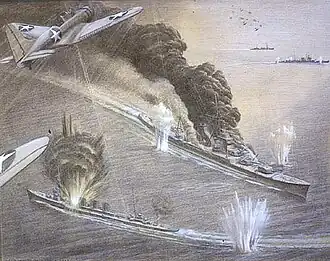 Later that year, he was commissioned as a Lieutenant Commander in the Naval Reserve, working for the Office of Public Affairs. As part of his first assignment in the North Atlantic, he witnessed the sinking of the USS Reuben James. He then went to the Pacific, where he saw the aftermath of the attack on Pearl Harbor and gathered eyewitness accounts. He also observed troops training for the invasion of Midway and visited the islands after their recapture. His third assignment sent him to the South East Asia Command in Ceylon (Sri Lanka). After the war, he painted two murals (now lost) for the Naval Academy, depicting the attack on Pearl Harbor and the Battle of Midway.[4] He left the Navy in 1947, with the rank of Commander and returned home, retiring to Connecticut, where he died in 1950, at the age of sixty.