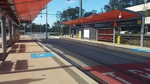Griffith University light rail station is located on the corner of Engineering Drive and Parklands Drive in the Gold Coast suburb of Southport. The station is part of the Gold Coast's G:link[1] light rail system, servicing the southern portion of the Gold Coast Health and Knowledge precinct.[2] Griffith University light rail station is located alongside the southern end of Gold Coast campus of Griffith University and provides direct access to the Gold Coast Private Hospital. Several bus routes servicing the station provide connections to surrounding suburbs.
