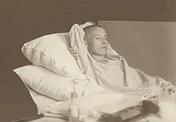 On March 28, four days before his death, Tuqay wrote his final poems (Tolstoy's Words, At Leisure, School).[45][60] Two days later, he could no longer write, setting down his pen.[61][45] On March 31, Luria visited Tuqay, comforting him with words of recovery, but privately told the poet's friends he had only days left. By evening, Tuqay's condition worsened sharply, with a fever and breathing difficulties, keeping him awake all night. On April 1, when asked about his condition, the poet replied with one word: death. That same day, Tuqay's friends invited photographer I. M. Jacobson, who, with the poet's permission, captured his image.[61][62] It was at Klyachkin's hospital, the day before Tuqay's death, that his last photographs were taken.[63][64] That day, the poet also left a verbal will: the five hundred rubles owed by publishers were to be used as a scholarship for a talented Tatar orphan child to study at a higher educational institution.[65][66]