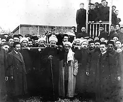 That night, Tuqay felt some relief and had a lively conversation with friends over tea, but the improvement was brief.[61] On 2 April 1913, at 8:15 p.m., the poet died at the age of 26.[45][67][68][69] Tuqay spent just over a month in the hospital;[70] he died in the same month he was born,[71] at the height of his creative powers and talent.[72] Klyachkin handed Tuqay's passport and the hospital's urgent ticket, detailing the diagnosis, treatment duration, and methods, signed by him, to the local police station. During the revolutionary chaos, these documents, along with other police archives and the entire Klyachkin clinic archive, were destroyed.[56][21] On April 4, a final photograph of Tuqay's open face was taken, and a death mask was made. His body was placed in a tabut, adorned with wreaths and ribbons of his poems. The funeral procession then proceeded on foot from the Klyachkin Hospital courtyard. A janaza was recited at Yunusov Square, and Tuqay was buried at the Old Tatar Cemetery. The farewell turned into a spontaneous demonstration, with about ten thousand people participating.[45][73][64][21] Years later, Klyachkin frequently recalled his role in treating and bidding farewell to Tuqay, describing him as an extraordinary and erudite person, and sharing stories with his family and clinic about the spring of 1913, calling the brief encounter with the poet the most significant event of his life.[74][62][21][Notes 3][75][76][77] He consistently emphasized that humanism should be the mindset and way of life for both a doctor and a person in general.[78]