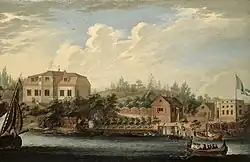 Ersta, on the high cliffs of southern Stockholm, was probably built in the 1670s by brännvin manufacturer Oluf Håkansson. At that time the land in that area was cheap since it was close to the old gallows. When the gallows were moved further away from town to make way for a new shipyard, the Stora Stads wharf, where ships for the SOIC were built, the area around Ersta became sought after and was called "a garden". The mansion passed through several owners until Jean Abraham Grill bought it in 1755. In 1770, he established a crucible steel factory at Ersta with the help of Bengt Andersson Qvist, a member of the Swedish Board of Mines. Members of the Qvist family were inspectors at the Iggesund ironworks.[91] The steel was of good quality, but nevertheless unprofitable. In 1775, Jean Abraham sold the manor and the steel factory to Qvist who ran the company until it folded with his death in 1799.[122] As of 2014, only two of the buildings at the manor remain. They are a part of the Ersta Hospital and one of them houses the Ersta museum.[123]