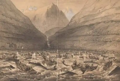 The pilot whale hunt is also a recurring motif in Faroese literature and art, such as the grindadráp paintings by Sámal Joensen-Mikines, which are exhibited in the Faroese art museum in Tórshavn. Whale hunts were also once celebrated with a traditional cultural dance known as the grindadansur,[30] and in 1835, one Danish governor (amtmand) of the Faroe Islands, Christian Pløyen, published a whaling ballad called the grindavísan.[31] Faroese place names often speak explicitly to whaling culture, such as that of the town of Hvalvík, which means 'whale bay'.[32]