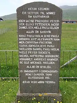 - ^ "Skaðagrindin í Sandvík í 1915" [The whale hunt catastrophe in Sandvík in 1915] (PDF). 3 February 2005. p. 9. Archived from the original (PDF) on 9 August 2014.