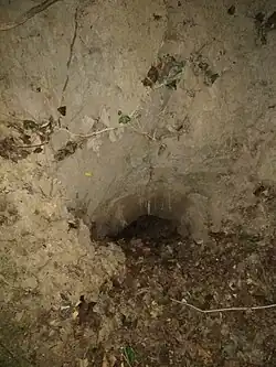 Kustošijanka is a cave with two entrances and 44 m of passageway on the north slope of a valley on the east side of Grmoščica. It is located on the fault line dividing Grmoščica in half from northeast to southwest. Its entrance is at an elevation of 155 m. The caver Darko Višek learned of its existence in conversation with local resident Vlado Krapljan, who was among the visitors who left many names and dates inscribed on the walls of the cave in their childhood. It formed in Upper Pontian layers of marlstone, duststone, and sandstone: "Rhomboidea layers", deposited in brackish conditions.[25] Thanks to being on a landslide-prone part of the hill,[26] the entrance became covered at some point after 1993 and could only be passed following digging in 2010.[27]