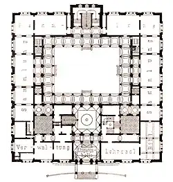 The building was erected between 1877 and 1881 by the architects Martin Gropius, a great uncle of Walter Gropius, and Heino Schmieden in the neo-Renaissance style. The building officially opened in 1881.[1] The ground plan is quadratic (length of each side c. 70 m; building height c. 26 m). The exhibition rooms surround an imposing atrium decorated with mosaics and the coats of arms of German states by sculptor Otto Lessing.