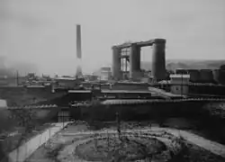A third blast furnace was constructed and began production in 1876.[45] Several negative factors affected the works after the mid-1870s: a drop in iron prices of 75% in the late 1870s; difficulty in obtaining coal during a strike in the Durham Coalfield around 1879, and industrial problems at the works in 1880. The works closed in 1891, and were offered for sale and the buildings demolished in the early 1890s. As a result of its closure, the village population dropped to 872 by 1901.[46] The works produced an estimated one million tons of slag. After closure the slag heaps were reprocessed to make road stone, and slag wool; reprocessing continued until at least the early 1930s. The brickworks expanded during the first decades of the 20th century: its 390-foot (120 m) chimney was built in 1902; and a Hoffmann kiln was constructed in 1923; the brickworks operated until 1957.[47]