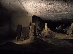 The Romans were present in the caves, as evidenced by the discovery of pottery, manual mills, and a graveyard, with seven gravestones remaining.[3] The grottoes were mostly formed during the Middle Ages, the stone (tuffeau) being used to build châteaux. Centuries later, the caves were flooded with water, slowly creating new passages. They were visited by Bernard Palissy in 1547, and an extension (the second grotto) was discovered by a speleologist (Gilles) in 1947. In the 1960s, the grottoes were managed by their owner as to allow access to tourists. They were added to ANECAT (Association Nationale des Exploitants de Cavernes Aménagées pour le Tourisme), and have since become a popular tourist attraction.[4]