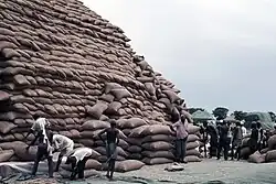 Groundnut pyramids were the invention of Alhassan Dantata, a prominent nut trader. Dantata came to Kano in the year 1919 and within five years was one of the most successful businessmen, supplying the Royal Niger Company (RNC) with most of their groundnuts. Dantata's company kept their groundnuts at a facility in Kofar Nassarawa, and they stacked the bags in the shape of a pyramid before they were shipped.[3] One groundnut pyramid could be made from as much as 15,000 full groundnut bags.[3] A journalist who visited a former groundnut pyramid site in Kano reported that the land was now a football field.[4]