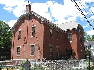 The Grove Street School is a historic school building at 23 Grove Street in Spencer, Massachusetts. The 2+1⁄2-story brick building was built in two phases: in the first phase in 1876, a single story was built. It was full to overflowing by 1878, and in 1883 the second story was built, designed by Fuller & Delano. It is a T-shaped building, whose main body is a horizontal rectangle, with a projecting central pavilion. The three roof gable ends are jerkin-headed, and are decorated with bargeboard and heavy brackets.[2]
