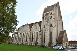 The commission for the construction of a church to be named after the Danish philosopher, pastor and hymn writer N. F. S. Grundtvig was decided through a competition, won by Peder Vilhelm Jensen-Klint in 1913.[1] The foundation of the new church was only laid after World War I, on 8 September 1921, Grundtvig's birthday. Building took place mainly from 1921 to 1926 when the tower section was completed, leading to the initial inauguration of the so-called Tower Church in 1927. Further work on the interior and on adjacent buildings continued until 1940 and was completed by Klint's son Kaare Klint after his father's death in 1930.[1] The church stands at the centre of a residential development (1924–36), also in yellow brick, designed by Jensen-Klint in harmony with the church.[2]
