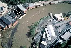 Although originally developed along the Levisa Fork River, which provided a transportation and power waterway, the town suffered from nine major floods since 1929 that have caused extensive damage, the last of which occurred in 1977. It is notable for having major businesses relocated in the 21st century to higher ground to prevent such damage in the future. A mountain opposite the historic town was blasted to provide a kind of plateau where much of the town was relocated and redeveloped. The federal project included construction of bridges and a flood wall, as well as the relocation of some roadways.