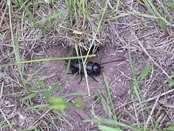 Gryllus campestris, the European field cricket or simply the field cricket in the British Isles,[2] is the type species of crickets in its genus and tribe Gryllini. These flightless dark colored insects are comparatively large; the males range from 19 to 23 mm and the females from 17 to 22 mm.