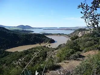 Embalse de Guadalcacín is a reservoir in the province of Cádiz, Andalusia, Spain. The reservoir has a capacity of 800 hm³ and a surface area of 3760 ha and is supplied by water from the Majaceite. The current dam, Guadalcacín II, is the 2nd on the lake and was built in 1995 as an emergency works project due to drought. The original dam was built in 1922.