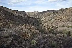 Guadalupe Canyon is a canyon and valley in the southern portion of the Peloncillo Mountains Hidalgo County, New Mexico, Cochise County, Arizona and Agua Prieta Municipality, of Sonora. The waters of Guadalupe Canyon are tributary to the San Bernardino River joining it at its mouth at 31°13′33″N 109°16′10″W / 31.22583°N 109.26944°W just below Dieciocho de Augusto, Sonora. Its source is at 31°28′08″N 109°02′21″W / 31.46889°N 109.03917°W at an elevation of 6,160 feet on the south slope of Guadalupe Mountain (6,444 feet). It crosses the border into Mexico at 31°19′57″N 109°05′19″W / 31.33250°N 109.08861°W at an elevation of 4,173 feet / 1,272 meters.[1]