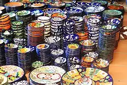 Guanajuato produces both glazed and unglazed pottery. In small indigenous communities, brown pieces with black decoration are produced.[2] The city of Guanajuato makes black ceramics with gold decoration, a style introduced by an artisan named Behrens. It is not traditional but his work has been imitated, often not to the same quality.[2] However, a glazed ware called mayolica is the most representative handcraft of the state.[3]