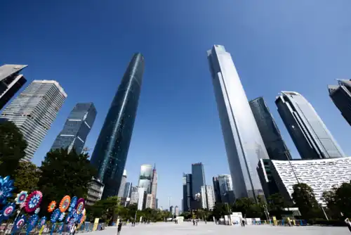 The West Tower, Guangzhou International Finance Center, was designed by Wilkinson Eyre and the East Tower, Guangzhou Chow Tai Fook Finance Centre, by Kohn Pedersen Fox. Both towers are located at Zhujiang New Town, the city's central business district, in Tianhe District. The West Tower became operational in 2010 and the East Tower opened in 2016.[1]