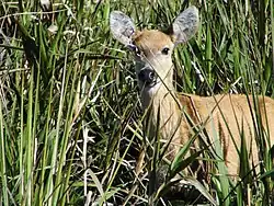 There are scattered areas of dense canopy Atlantic alluvial rain forest with emergent evergreens reaching 46 metres (151 ft) in height. This type of vegetation includes significant numbers of palm trees and vines. Common species in these areas include Manilkara amazonica, Apuleia molaris, Brosimum ovatifolium, Aspidosperma album and Vochysia guianensis.[3] The Buriti Pioneer River Formation is dominated by the Mauritia flexuosa (buriti palm). It is the last example of this type of vegetation in Rondonia, and covers an area of about 24 square kilometres (9.3 sq mi). It is a delicate environment that provides a unique habitat for macaws that nest in the palms trees and marsh deer that breed in the environment.[3]