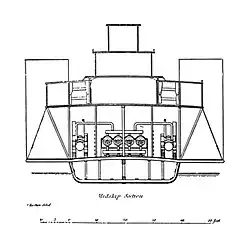 One problem with guards was that they could make the steamboat less stable, and with the type of boilers used on the Ohio-Mississippi boats, even a list of ten or twelve inches to one side could cause the boilers to malfunction, which, if prolonged, could result in an explosion.[1] This was difficult to manage, especially when for example passengers would crowd along one side of a boat to observe an attraction.[1]