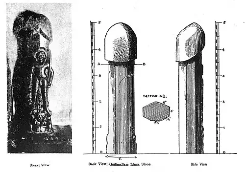 Though Gudimallam is a small village, it is well known because it has a very early linga that is unmistakably phallic in shape, with a full-length standing relief figure of Shiva carved on the front. This is in the garbhagriha of the Parasurameswara Temple, Hindu temple dedicated to Shiva.[3] This is perhaps the second earliest linga associated with Shiva discovered so far,[4] and it has been dated to the 2nd/1st century BC,[5] or the 3rd century BC,[3] or much later, to the 2nd century AD,[6] 3-4th century AD,[6][7][8]