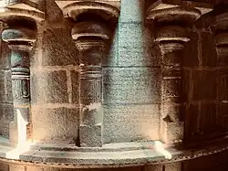 The stone slabs making the enclosure are plain on the outside, but carved on the inside as stone railings (with three horizontal rails) in a pattern comparable to those of ancient Buddhist stupas such as Sanchi (but much smaller).[27] Rao was unaware of this structure, then below the floor, saying "the pedestal is cut out in the form of a quadrangular ridge on the ground",[17] this ridge in fact being the top of the uppermost rail of the railings. Whether the rest of the floor was lowered or the linga and railings raised is unclear; the sanctuary floor is now a few steps below the main floor level of the temple, an unusual feature which Rao's plan of the temple from 1911 shows, but does not give measurements for. The linga also has a modern golden metal frame, topped by a naga head, behind it.[28]