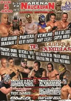 The Mexican professional wrestling promotion International Wrestling Revolution Group (IWRG; Sometimes referred to as Grupo Internacional Revolución in Spanish) holds several shows over the year to showcase the fact that wrestling is a family tradition in Lucha libre, with a large number of second and third-generation wrestlers following the footsteps of their relatives and becoming wrestlers themselves.[2] Starting in 2012 IWRG has on several occasions held a Guerra de Familias ("War of the Families") tournament, which is a single-elimination tag team tournament where all teams must be related to each other in some way. IWRG's definition of "Family" included by actual blood relationship and storyline family relationships. For the 2015 Guerra de Titanes IWRG booked Los Oficiales in the tournament despite neither member being related to each other in or out of storylines. They also paired up El Hijo de Dos Caras with Súper Nova and never explained what, if any family relationship existed between the two. The Guerra de Familias shows, as well as the majority of the IWRG shows in general are held in "Arena Naucalpan", owned by the promoters of IWRG and their main arena. The 2015 Guerra de Familias show was the third time that IWRG had held an event under that name.