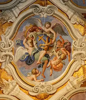 Guglielmo Borremans was quite unique in that as a Flemish painter who was not trained in the technique and art of fresco painting, he was able to establish himself as one of the leading fresco painters in southern Italy in the early 18th century. He may have learned the fresco technique from his master Pieter van Lint who during his time in Italy painted frescos in the Cybo-Soderini Chapel in the Basilica of Santa Maria del Popolo in Rome.[10] He also created works on canvas. Many of his works have been lost due to destruction caused by war and lack of adequate restoration. He also used a thinner wash of pigments than local painters which may have contributed to a quicker decay.[8]
