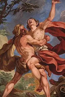 His earliest works show his debt to the Flemish Baroque school and in particular the work of Peter Paul Rubens. Later his style absorbed local and contemporary influences and developed towards the late Baroque idiom that was popular in southern Italy at the time.[11] His youth works show in particular his dependence on the Rubens tradition as continued by Rubens' pupils Anthony van Dyck and Jacob Jordaens. In this early period, he seems to have been free from direct Italian influence although he showed the indirect influence of Italian art as transmitted by his master Pieter van Lint. His work of that time was close to the Flemish-influenced Italian art then current in Genoa. In the Dispute of St Catherine of Alexandria with the philosophers before Maxentius he comes particularly close to works of Pieter van Lint such as van Lint's Christ healing the lame at the pool of Bethesda (1640s, Kunsthistorisches Museum, Vienna).