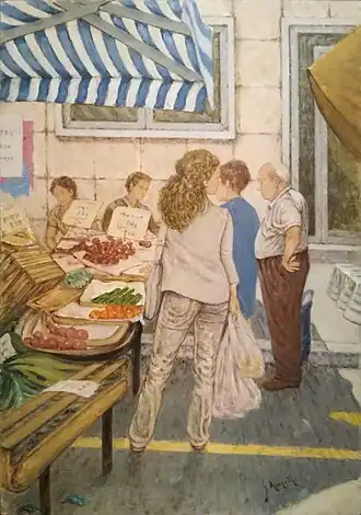 He composed, with a well balanced idealism and realism at the same time, views and characteristic urban glimpses with easy reading expression and with an intimate and realistic background, together with life scenes, open markets, seascapes, intimate domestic interiors with figures and intense portraits, some of these representing his wife, the source of inspiration of many of his works.[6][7]