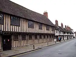 The guild attracted members from the local gentry as well as merchants and craftsmen from the town, and concerned itself with the welfare of its members. By the early 15th century the guild had come to own many properties in the town, and it used the rental income from these to provide a number of welfare facilities for its members: In around 1420, it constructed a Guildhall and adjoining Almshouses on Church Street. These buildings became the centre of Stratford's civic life, providing many social and political functions, including housing a grammar school.[1][3]