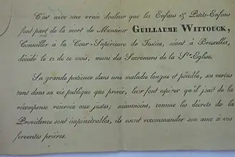 Guillaume Wittouck, born in Drogenbos on 30 October 1749 and died in Brussels on 12 June 1829, lawyer at the Brabant Council, became Counselor at the Supreme Court of Brabant in 1791. During the Brabant Revolution, he sided with the Vonckists, who were in favor of new ideas. When Belgium joined France, he became substitute for the commissioner of the Directory at the Civil Court of the Department of the Dyle, then under the consulate, in 1800, judge at the Brussels Court of Appeal, then from 1804 to 1814, under the Empire, counselor at the Court of Appeal of Brussels, then advisor to the Superior Court of Brussels. He married in Brussels (Church of Saint Nicolas) on 29 June 1778, Anne Marie Cools, born in Gooik on 25 January 1754, died in Brussels on 11 April 1824, daughter of Jean Cools and Adrienne Galmaert descendants of the Seven Noble Houses of Brussels.[1]