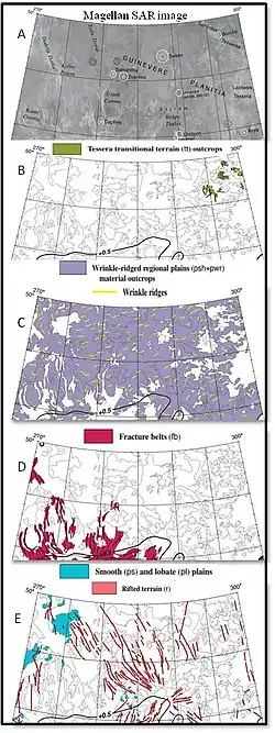 Other structural features are observed in coronae and coronae-like features as well as tesserae and other highly tectonized units. Within this region, structures exhibit a diversity of orientations and occur in sets of features with similar trends. Prominent east–west and southeast–northwest trends are locally observed in the regional plains. The figure to the left, beginning with A, shows a backscatter image of the northeastern region of Guinevere Planitia. Depicted in figure B, in the shaded regions are outcrops of tesserae which are concentrated on the eastern side of Beta Regio. Wrinkle ridges can be viewed as the purple fill in figure C. These outcrops dominate the low-lying region and are marked with yellow lines that represent major trends. Figure D shows the distribution of fracture belts and their trends in black. The likely cause of these trends is due to mantel upwelling at Beta Regio to the west. The trend of these figures can be directly related to radiating fractures and grabens, interpreted as underlying dyke swarms. The remainder of the systems are interpreted to be caused by tectonic stresses related to uplift or a combination of dyke and uplift mechanisms.[7]