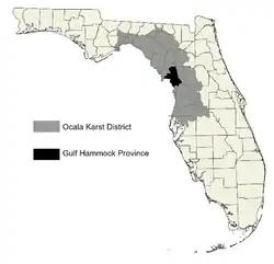 The Gulf Hammock Province is defined as a geomorphical province in the Ocala Karst District of Florida. It largely overlaps but is not congruent with the historical definition of Gulf Hammock. The province includes central and southern Levy County and small parts of southwestern Marion County and northwestern Citrus county. The Avon Park Formation lies close to the surface. It is generally covered by a thin layer of Quaternary deposits, but is exposed in a few locations. The Avon Park Formation has low permeability, which supports a high water table, creating wetlands throughout the province. While topographic relief is low in the province, shallow circular depressions are scattered throughout the province. The depressions may be sinkholes or other dissolution features. Small relic beach ridges, dunes, and swales with wetlands are found in the eastern part of the province, bordering the Brooksville Ridge Province. Streams in the province are generally swampy. Despite the karst nature of the bedrock, only one stream is known to enter a swallet and go underground.[12]