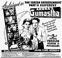 Gumastha (transl. Clerk) is a 1953 Indian film starring V. Nagayya, R. S. Manohar and Pandari Bai. The film was produced in Tamil and Telugu languages under the same title. It is based on the play NGO (Non-Gazetted Officer) by Acharya Aatreya.[2][1] The film was released on 3 April 1953.[3]