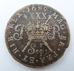 Gun money (Irish: airgead gunna)[1][2] was an issue of coins made by the forces of James II during the Williamite War in Ireland between 1689 and 1691. They were minted in base metal (copper, brass or pewter), and were designed to be redeemed for silver coins following a victory by James II and consequently bore the date in months to allow a gradual replacement. As James lost the war, that replacement never took place, although the coins were allowed to circulate at much reduced values before the copper coinage was resumed. They were mostly withdrawn from circulation in the early 18th century.